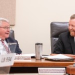 State Sens. Rick Holdcroft of Bellevue (left), and John Cavanaugh of Omaha before a meeting of the General Affairs Committee regarding medical cannabis legislation led by both senators. Holdcroft is committee chair. Cavanaugh is committee vice chair, Feb. 2, 2026. (Zach Wendling / Nebraska Examiner)