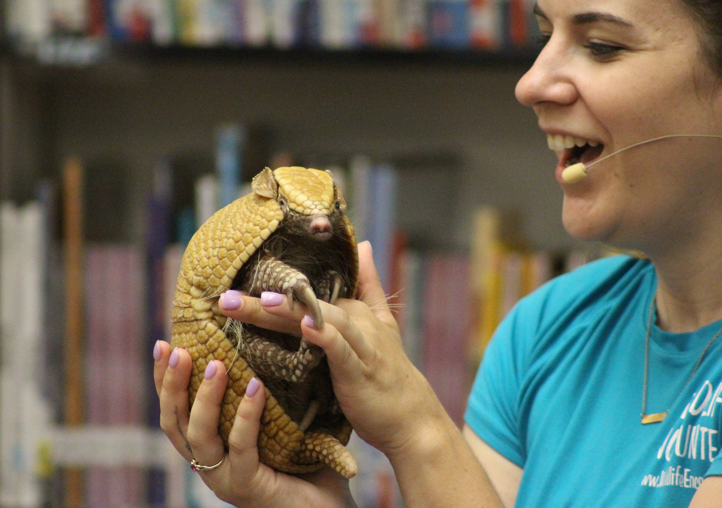 Families gathered at Wildewood Elementary School to meet several animals from Wildlife Encounters. The educational program was sponsored by Ralston’s Baright Public Library as part of its summer program. It was originally scheduled for Wildewood Park, but the hot temperatures Wednesday, June 28, 2021, forced the event to relocate. Attendees were introduced to Tater Tot the armadillo, Captain Crunch the alligator, Peanut Butter the hedgehog, Snickers the boa constrictor, Oliver the kinkajou and Tuck the red kangaroo. Books reflecting upon animals were also recommended. (Photos by Scott Stewart)