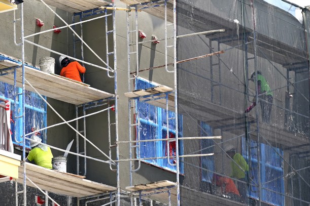 Construction workers plaster the exterior of a new apartment building, July 5, 2023, in Orlando, Fla. (John Raoux / AP Photo)