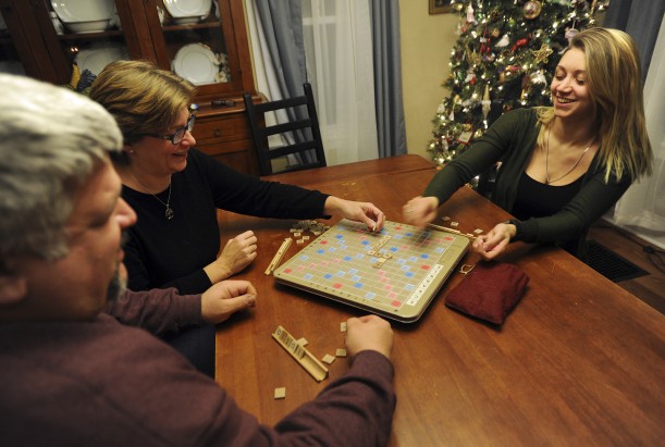 Alexandra Pisco (right) plays a game of Scrabble with her parents Rich and Wendy DiCarlo at their home in Derby, Conn. With its high cost of living and proximity to New York City, young people across southwestern Connecticut say they're feeling the economic pressures prompting them to live with their parents. (Brian A. Pounds / Hearst Connecticut Media via AP)