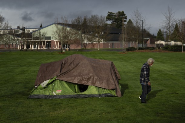 With Fruitdale Elementary School in the background, a homeless person walks near a tent in Fruitdale Park, Saturday, March 23, 2024, in Grants Pass, Ore. The rural city of Grants Pass in southern Oregon has become the unlikely face of the nation's homelessness crisis as its case over anti-camping laws goes to the U.S. Supreme Court. The case has broad implications for cities, including whether they can fine or jail people for camping in public. (Jenny Kane / AP Photo)