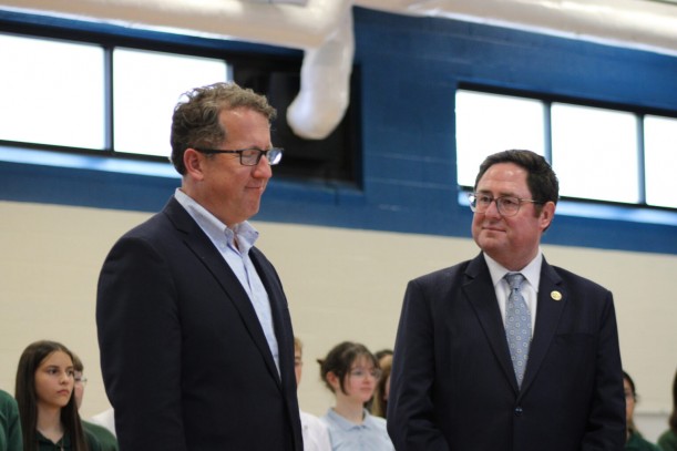 Nebraska U.S. Reps. Adrian Smith and Mike Flood at St. Teresa Catholic School in Lincoln on Sep. 29, 2025. (Juan Salinas II / Nebraska Examiner)