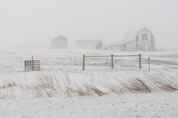 An American flag is mounted on a fence at a farm on U.S. Highway 20 during a blizzard near Galva, Iowa, on Jan. 13, 2024. (Carolyn Kaster / AP Photo)