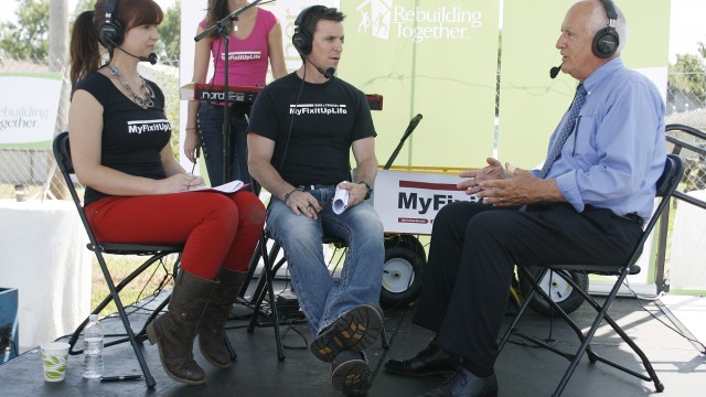 Stephen Torsell, Ex. Dir. of Homes on the Hill Developement Corp. (right) appears on the MyFixItUpLife radio show with hosts Theresa Clement (left) and husband Mark (center). Hundreds of volunteers participated in Rebuilding Together’s Building a Healthy Neighborhood event Friday, June 21, 2013 in the Hilltop neighborhood of Columbus, Ohio. (Mike Munden / AP Images for Rebuilding Together)