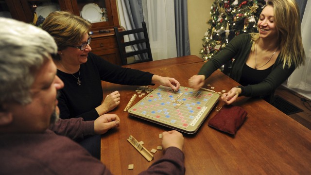 Alexandra Pisco (right) plays a game of Scrabble with her parents Rich and Wendy DiCarlo at their home in Derby, Conn. With its high cost of living and proximity to New York City, young people across southwestern Connecticut say they're feeling the economic pressures prompting them to live with their parents. (Brian A. Pounds / Hearst Connecticut Media via AP)