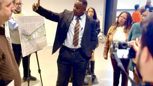George Achola, a representative of the team working on the northeast Omaha business park development, explains during a January community meeting that a possible use for part of a 67-acre area near 16th and Locust Streets includes a youth sports facility. That is one of two sites the team decided to purchase for the business park initiative. (Cindy Gonzalez / Nebraska Examiner)