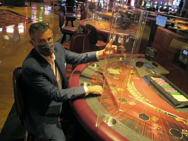 Ron Baumann, a regional president with Caesars Entertainment, sits at a card table at Harrah’s casino on July 1, 2020, in Atlantic City, N.J., where plexiglass barriers have been installed to separate gamblers to prevent the spread of the coronavirus. On Monday, Jan. 25, 2021, the company replaced Baumann, who had overseen the Caesars and Harrah’s casinos, with two new executives. (AP)
