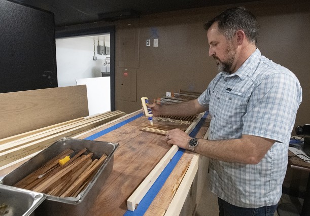 Aaron King, owner of Genoa Food Co. at 126 2nd Street in Malcolm, Neb, works on covering the bar with Brazilian cherry wood on Monday, April 26, 2021. Now, after nearly five months of nonstop renovations both inside and out, the Kings are getting close to opening Genoa Food Co. (Gwyneth Roberts/Lincoln Journal Star via AP)