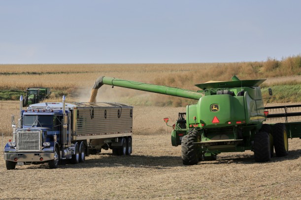 A combine loads soybeans into a grain truck in rural Blair, Nebraska October 17, 2019. (Nati Harnik / AP Photo)