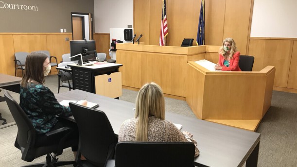 Michelle Paxton, director of the Children’s Justice Clinic, talks with two student attorneys in the Judge Donald R. and Janice C. Ross Courtroom in the College of Law. Clinic student attorneys practice with Paxton before going to court. (University of Nebraska)