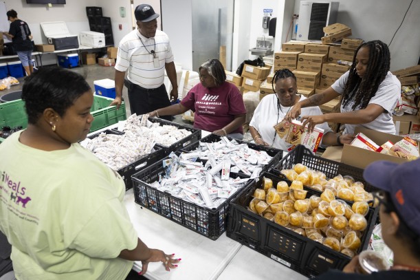 Meals on Wheels employees take advantage of an assembly line to prepare bags of food for clients, Friday, July 12, 2024, in Houston. Staff deliver hot meals as well as shelf stable items to clients daily, many of whom are still without power after Hurricane Beryl. (Annie Mulligan / AP Photo)