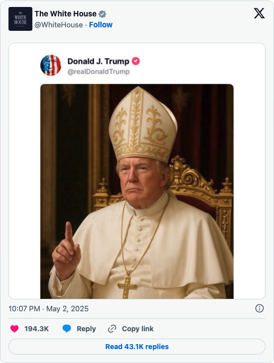 The White House has released AI images of Trump as the pope, as Superman and as a Star Wars Jedi, ready to do battle with “Radical Left Lunatics” who would bring “Murderers, Drug Lords … & well-known MS-13 Gang Members” into the country.