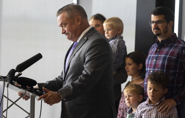 Rep. Don Bacon, R-Neb gets emotional as he announces his retirement during a press conference at Eppley Airfield in Omaha, Neb. on Monday, June 30, 2025. (Chris Machian / Omaha World-Herald via AP)