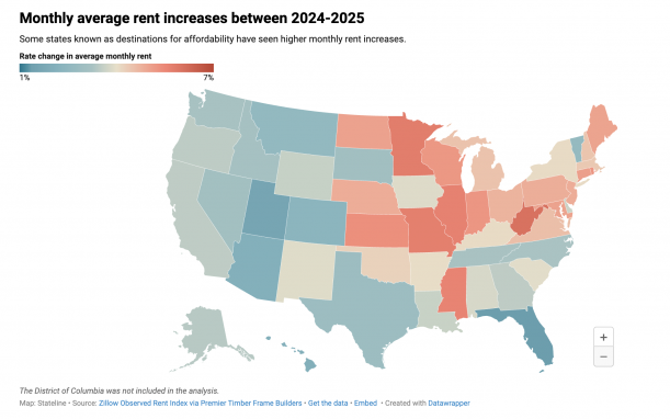 A new analysis from Premier Timber Frame Builders – based on data from Zillow’s Observed Rent Index, which tracks prices for both apartment units and single-family rental homes nationwide — shows that average monthly rents are climbing in the Midwest and portions of the South.