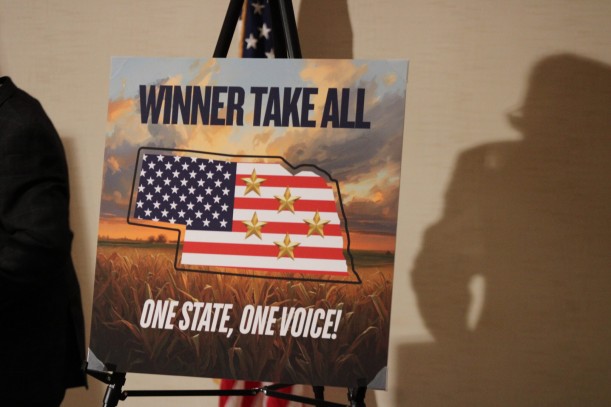 A winner-take-all sign at a press conference in Lincoln on Oct 14, 2025. (Juan Salinas II / Nebraska Examiner)