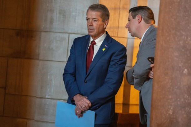 Nebraska Gov. Jim Pillen (left), listens to his chief of staff, Dave Lopez, Jan. 28, 2026. (Zach Wendling / Nebraska Examiner)