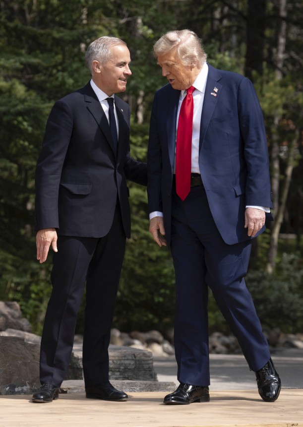 US President Donald Trump is greeted by the Prime Minister of Canada Mark Carney (left), at the G7 summit in Kananaskis, Alberta, Canada, Monday June 16, 2025. (Stefan Rousseau / Pool Photo via AP)
