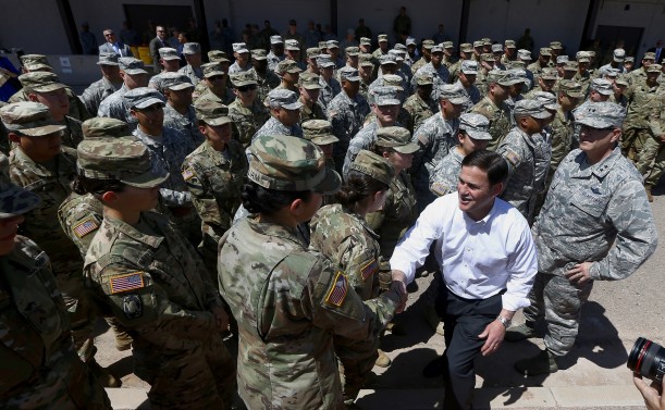 Arizona's Republican Gov. Doug Ducey (front right) meets with Arizona National Guard soldiers prior to their deployment to the Mexico border at the Papago Park Military Reservation on Monday, April 9, 2018, in Phoenix. (Ross D. Franklin / AP Photo)