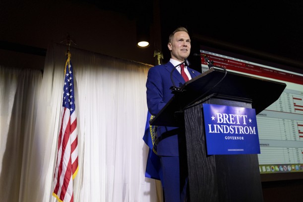 Brett Lindstrom, Republican candidate for Nebraska governor, concedes the race during an election results watch party in Omaha, Neb., on Tuesday, May 10, 2022. The race was called for Jim Pillen. (Anna Reed / Omaha World-Herald via AP)