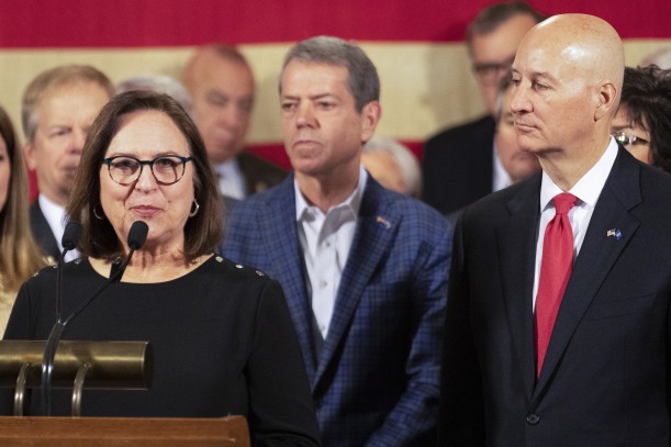 Sen. Deb Fischer, R-Neb. (left) speaks after Gov. Jim Pillen (center) announced the appointment of former governor Pete Ricketts to Nebraska's vacant U.S. Senate seat on Thursday, Jan. 12, 2023, at Nebraska State Capitol in Lincoln, Neb. (Kenneth Ferriera / Lincoln Journal Star via AP)