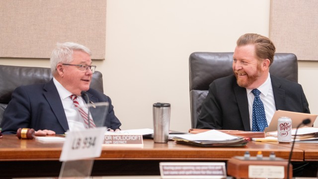 State Sens. Rick Holdcroft of Bellevue (left), and John Cavanaugh of Omaha before a meeting of the General Affairs Committee regarding medical cannabis legislation led by both senators. Holdcroft is committee chair. Cavanaugh is committee vice chair, Feb. 2, 2026. (Zach Wendling / Nebraska Examiner)