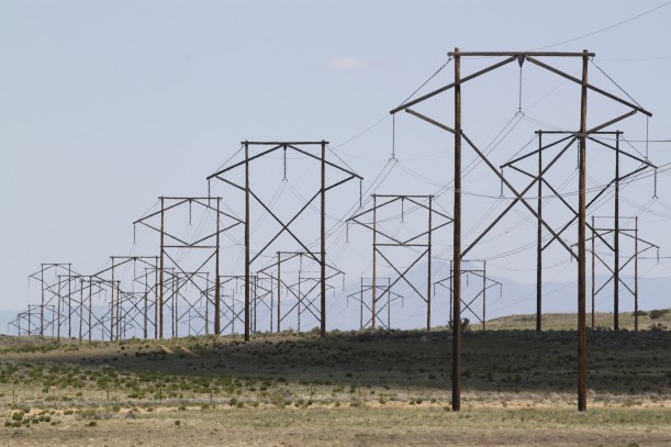 This May 20, 2012 file photo shows one of the major transmission lines that runs to the west of Albuquerque, N.M. The federal government has finished another environmental review of a proposed transmission line that will carry wind-generated electricity from rural New Mexico to big cities in the West and similar reviews are planned for two more projects that would span parts of Utah and Nevada, the U.S. Interior Department announced Thursday, April 28, 2022. (Susan Montoya Bryan / AP Photo)