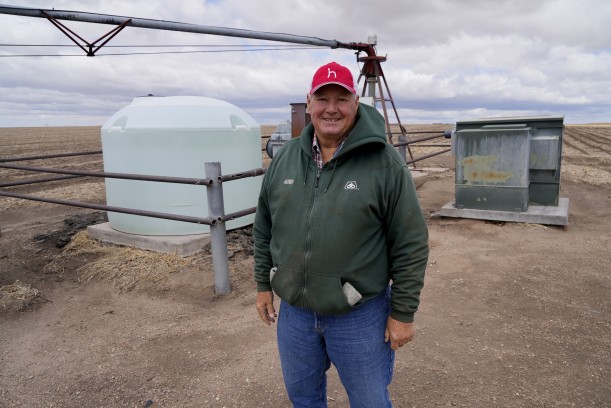 Steve Hanson poses for a photo in front of one of his water pumping stations Saturday, April 30, 2022, in Elsie, Neb. He raises beef cattle and grows corn, all of his irrigation water coming from the Ogallala Aquifer. (Brittany Peterson / AP Photo)