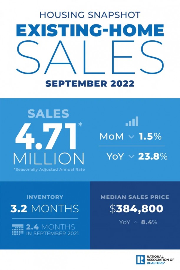 The National Association of Realtors is reporting that existing home sales were down 1.5% in September to a seasonally-adjusted annual rate of 4.71 million (down 23.8% year over year). Total housing inventory at the end of September was 1,250,000 units, down 2.3% from August and down 0.8% from one year ago. Unsold inventory sits at a 3.2-month supply at the current sales rate with properties remaining on the market for around 19 days. The median existing-home price for all housing types in July was $384,800, up 8.4% from one year ago.