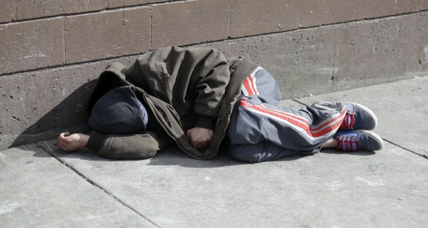 A homeless teenager sleeps on the ground outside a homeless shelter in Salt Lake City, Utah. (Rick Bowmer / AP Photo)