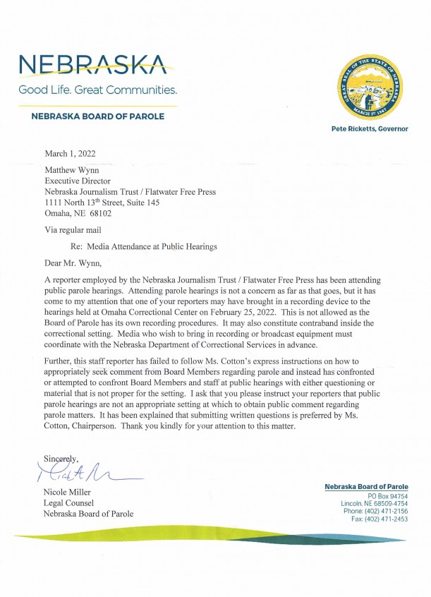 This letter was sent from Nicole Miller, Legal Counsel to the Nebraska Board of Parole, to Matthew Wynn, Executive Director for the Flatwater Free Press. (Photo provided by Flatwater Free Press.)