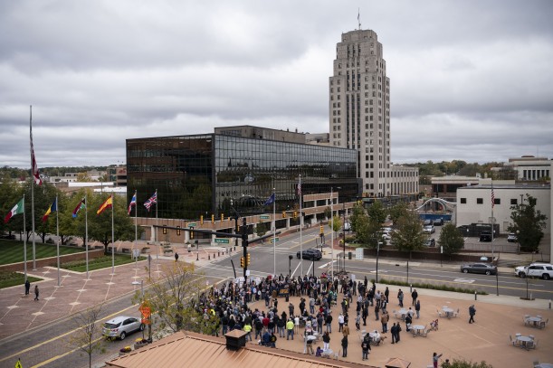 Union members and supporters gather during a rally outside Kellogg’s World Headquarters on Oct. 27, 2021, to support workers on strike in Battle Creek, Mich. Kellogg’s plans to start hiring permanent replacements for some of its 1,400 striking workers. (Alyssa Keown/Battle Creek Enquirer via AP)