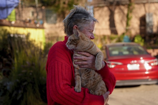 Denise Johnson holds her cat Ramsey after the Eaton Fire. Her home was one of the few in her immediate neighborhood that survived, but recovery will take time for everyone. (Jae C. Hong / AP Photo)