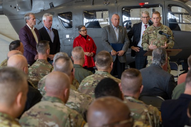 Adj. Gen. Craig Strong (at podium) addresses Nebraska National Guard members alongside (from left) Gov. Jim Pillen, State Sens. Loren Lippincott, Rita Sanders and Tom Brewer, and Lt. Gov. Joe Kelly to celebrate Guard recruitment and retention legislation, Dec. 10, 2024. (Zach Wendling / Nebraska Examiner)