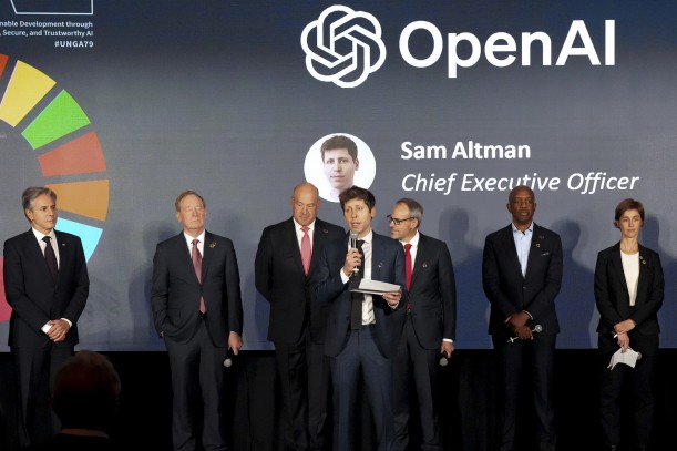 OpenAI Chief Executive Officer Sam Altman (center) speaks at the Advancing Sustainable Development through Safe, Secure, and Trustworthy AI Event on Sept. 23, 2024, in New York. (Bryan R. Smith / AP Photo)