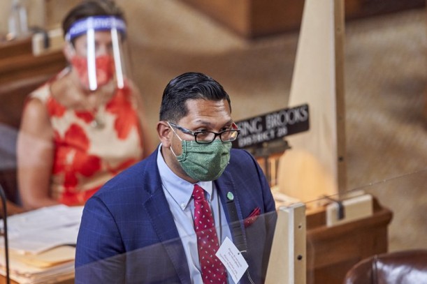 State Sen. Tony Vargas of Omaha speaks during debate in Lincoln, Wednesday, July 29, 2020. Sen Vargas fell two votes short of introducing a meatpacking safety bill in the waning days of the 2020 session. (AP)