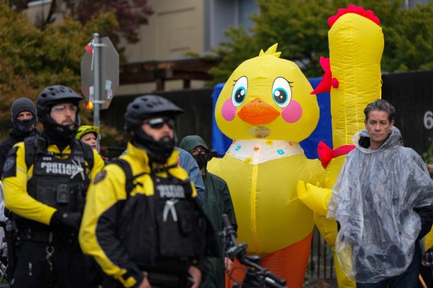 Demonstrators in inflatable costumes stand in protest against Donald Trump's immigration policies and attempts to mobilize the National Guard, Sunday, Oct. 12, 2025, in Portland, Ore. (Jenny Kane / AP Photo)
