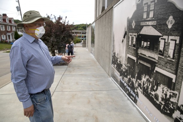 Historic Lincoln-Fairview Neighborhood Association board member Mark Petersen points out details in a photo of the former Council Bluffs Fire Department Central Station, 69 N. Main St., circa 1920, as fellow board members celebrate the installation of three photo murals on Oakland Avenue depicting the area’s history on Tuesday, Aug. 18, 2020. The murals are part of the three-pronged use of a $15,000 “walkability” grant the association received from The 712 Initiative and its Neighborhood Network Initiative through funding by the Iowa West Foundation. (Joe Shearer/Daily Nonpareil via AP)