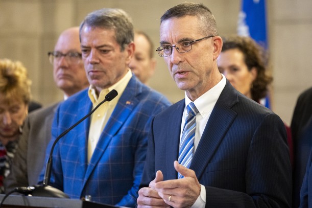 Department of Health and Human Services CEO Steve Corsi (right) joins Gov. Jim Pillen (left) at a press conference in the Warner Chamber at the Capitol, Monday, Feb. 12, 2024, in Lincoln, Nebraska. Corsi formerly served as CEO of the Central Wyoming Counseling Center, which is slated to receive $3.4 million of Nebraska’s Opioid Treatment Infrastructure Cash Fund. (Kenneth Ferriera / Lincoln Journal Star via AP)