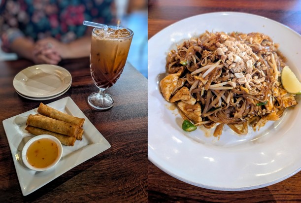Chicken egg rolls, Thai iced tea, and chicken Pad Thai served at Sabaidee Thai Lao Cuisine. (Courtesy of Matt Hebert)