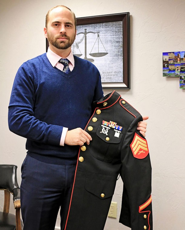 Brendan Rice, an attorney at the Scottsbluff firm of Chaloupka, Holyoke, Snyder, Chaloupka & Longoria, holds his jacket from his Marine Corps Reserve uniform. (AP)