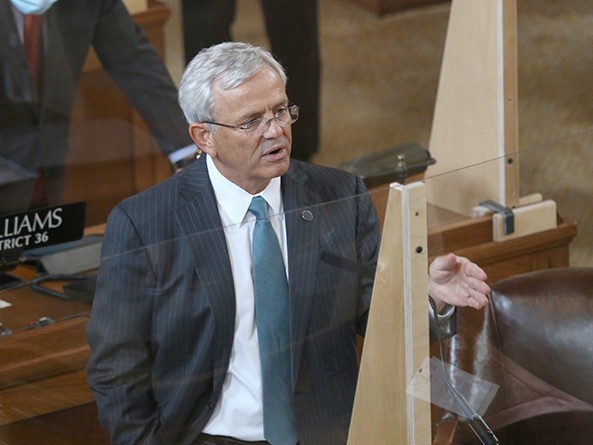 Speaker Jim Scheer of Norfolk speaks in Lincoln, Wednesday, Aug. 5, 2020, as lawmakers debate a property tax and business incentive package. (AP)
