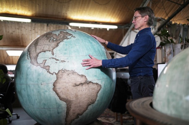 Peter Bellerby, the founder of Bellerby & Co. Globemakers, holds a globe at a studio in London, Tuesday, Feb. 27, 2024. (Kin Cheung / AP Photo)
