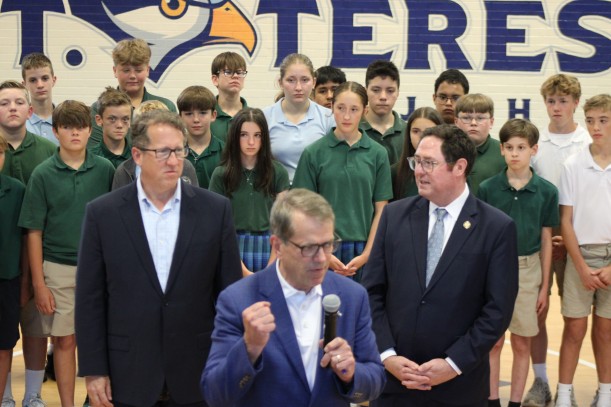 Nebraska Gov. Jim Pillen talking in front of U.S. Reps. Adrian Smith and Mike Flood at St. Teresa Catholic School in Lincoln on Sep. 29, 2025. (Juan Salinas II / Nebraska Examiner)