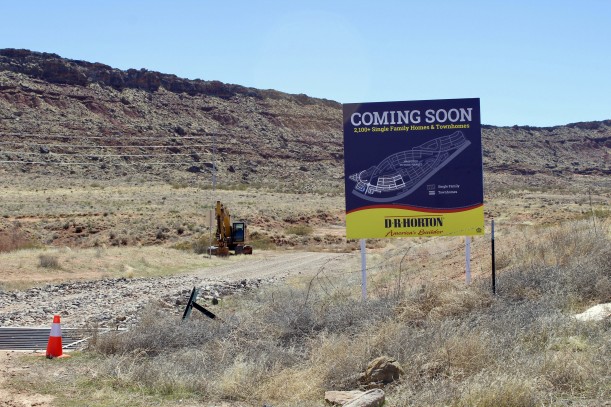DR Horton developer’s sign is posted at the existing exit for Long Valley Road showing plans for a new 2,100 single family homes and townhomes subdivision along the Southern Parkway near Sand Hollow Reservoir in Washington County, Utah, March 28, 2021. Warren Buffett’s company appears to be betting on the housing market picking up because Berkshire Hathaway bought more than $700 million worth of homebuilder DR Horton’s stock in the spring of 2023 along with smaller stakes in fellow builders Lennar Corp. and NVR Corp. (Joan Meiners / The Spectrum via AP)